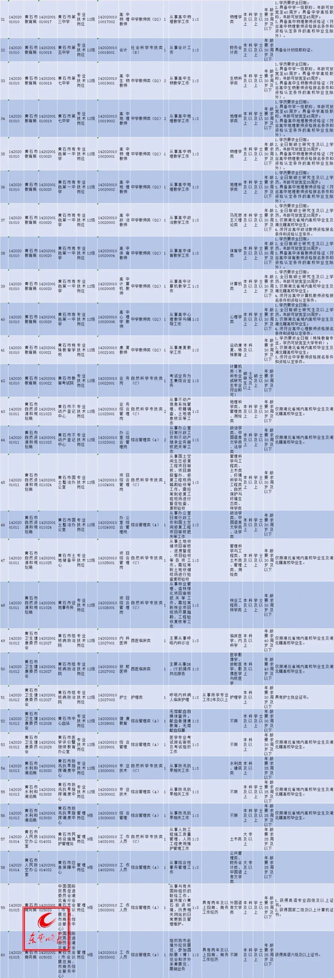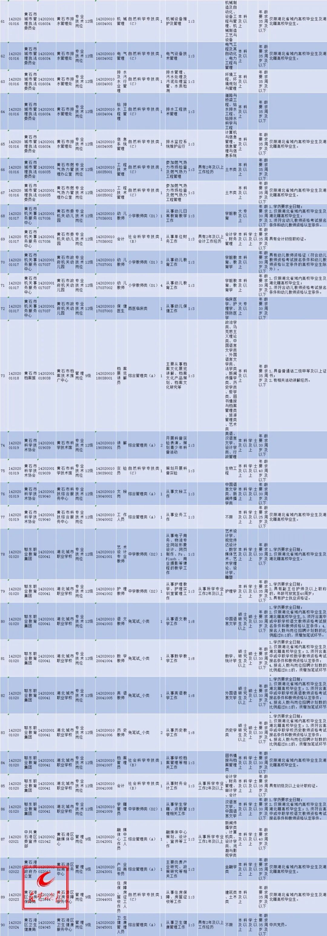 点击查看黄冈市直事业单位2020年统一组织公开招聘工作人员岗位表
