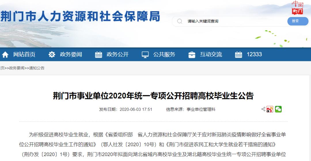 6月3日,荆门市人社局发布荆门市事业单位2020年面向社会统一公开招聘工作人员和统一专项公开招聘高校毕业生公告。