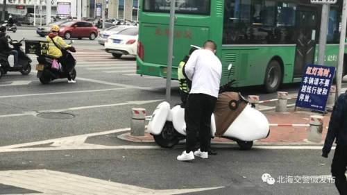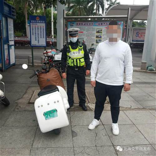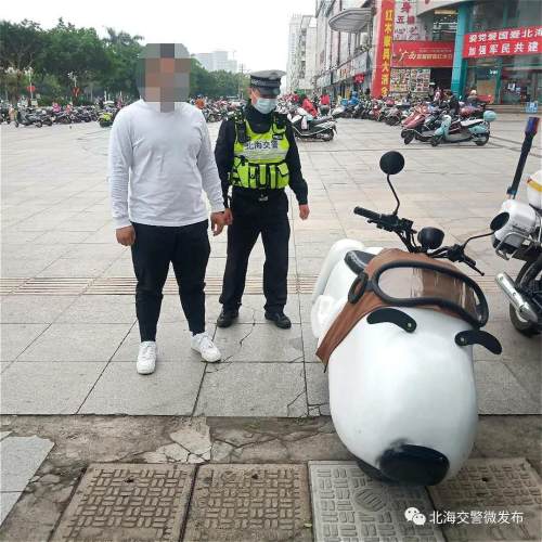 4月1日下午,北海交警第一大队执勤民警在北海大道北京路口执勤时,一辆造型夸张的电动车吸引了执勤人员的注意。