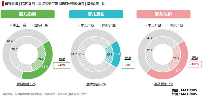 近两年来母婴各个细分品类中,国货力量正加速崛起。尼尔森数据显示,2019年6月-2020年5月,聚焦线下母婴渠道TOP10婴儿重点品类厂商,婴幼儿奶粉国货品牌、婴幼儿洗护本土厂商销售份额分别占比38.4%、45.7%,其中国产奶粉增速达47%,婴幼儿洗护国货则实现153%的超高增速。