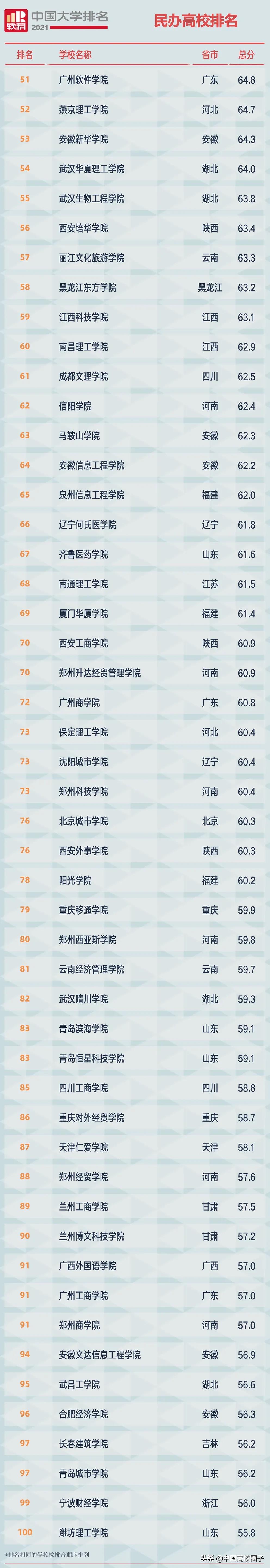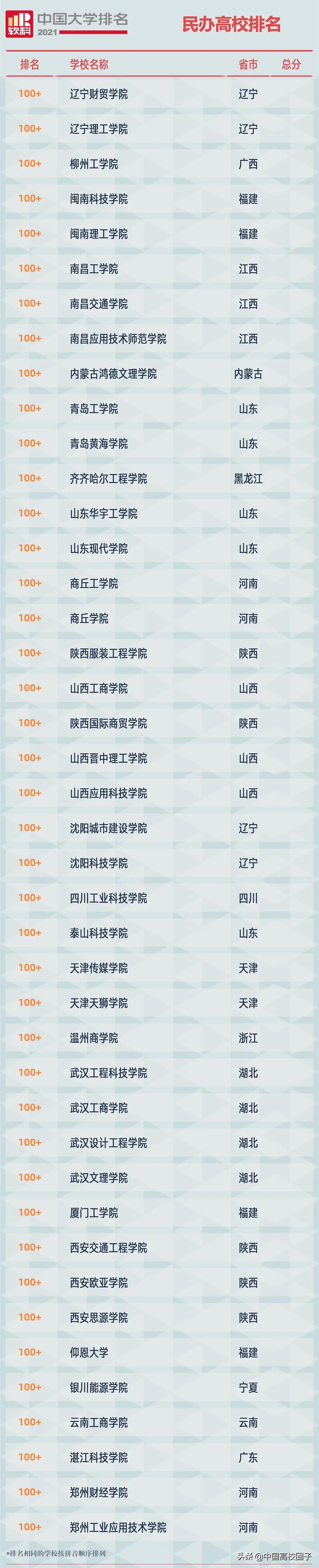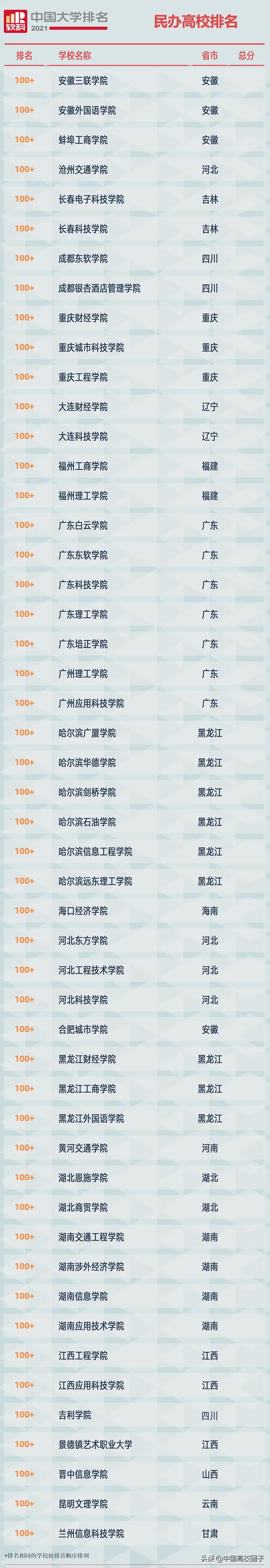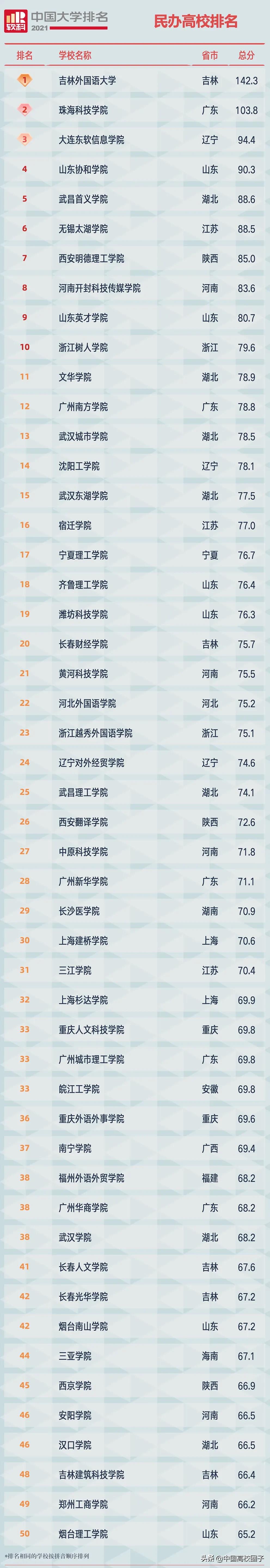 2021软科中国民办高校排名上榜高校共192所,排名最高的三所学校是吉林外国语大学、珠海科技学院、大连东软信息学院。2021软科中国民办高校排名榜单中有46所是由独立学院转设而来,其中23所位列2021中国民办高校排名百强,体现了率先完成转设的这批独立学院的办学实力,他们的转设将发挥示范作用,推动中国民办高等教育规范发展。