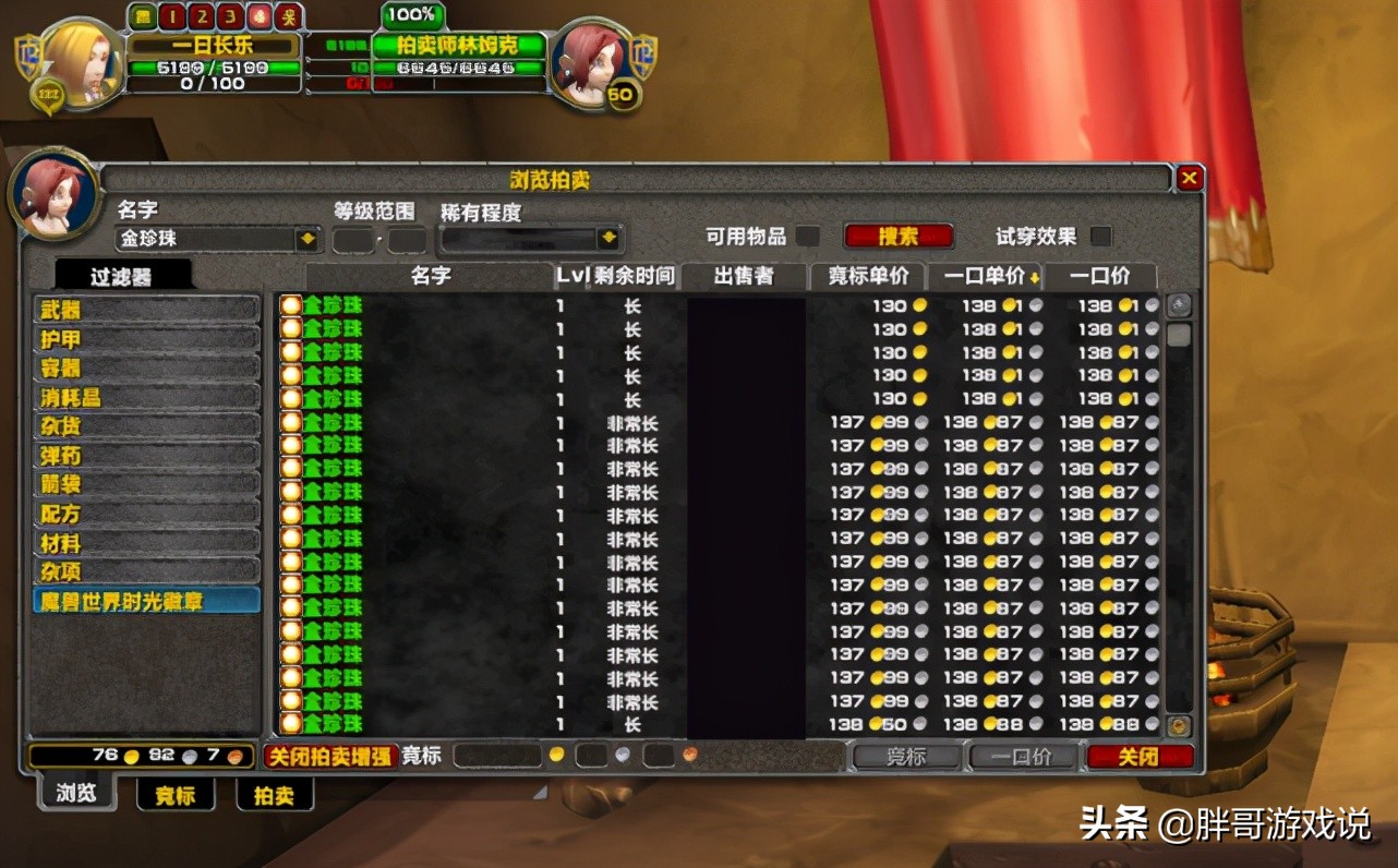 虽然60级怀旧服已经进入了尾声,绝大部分材料价格都在下降,但是以胖哥所在的无畏服务器为例,一颗金珍珠的价格依然在130金币左右。既然价格如此之高,自然有玩家希望通过刷金珍珠的方式赚金币,于是便出现了一名头铁玩家。