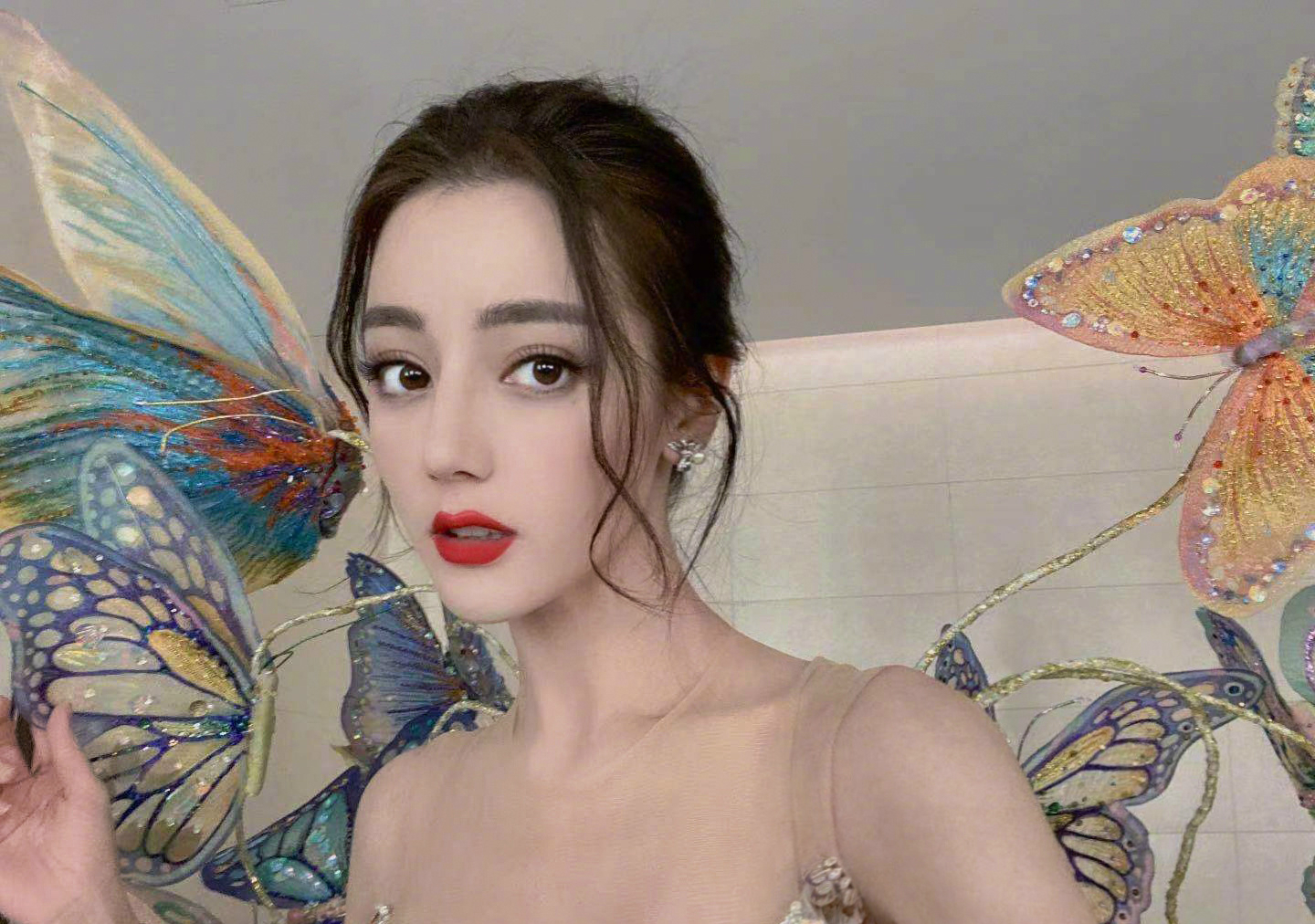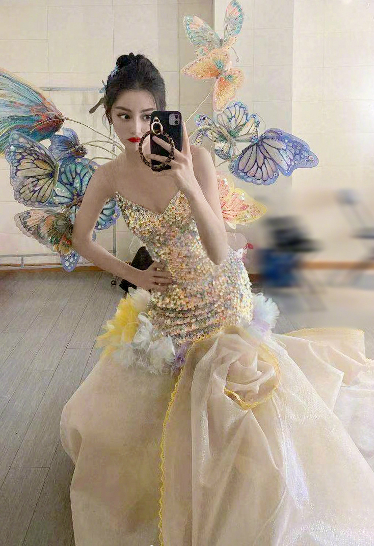 照片中的迪丽热巴,身穿蝴蝶裙,做着可爱的搞怪表情,犹如迪士尼在逃公主,要不要这么美啊。