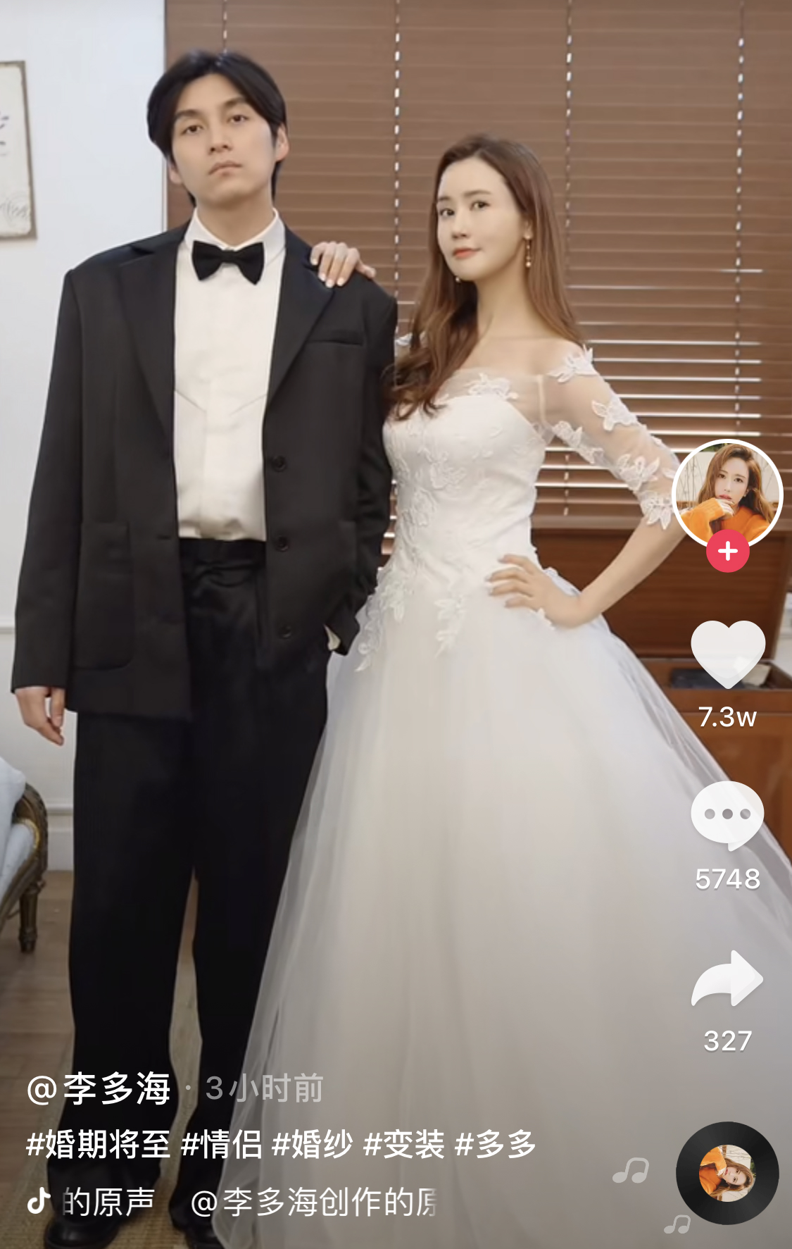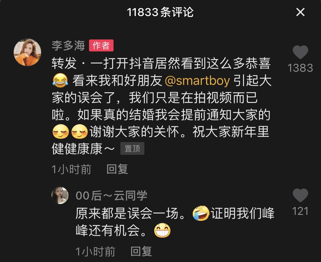 尤其是这段视频的配文,写着婚期将至,还有情侣,婚纱等话题名。不过,李多海本人在留言区回复了这条消息——原来是乌龙了,其实是好朋友拍的视频而已。