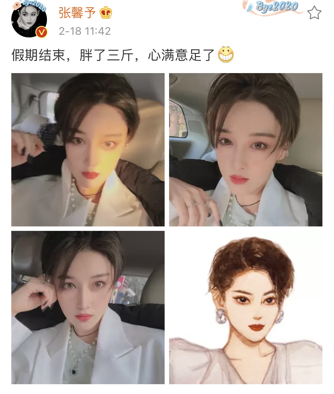 18日,张馨予终于晒自拍了,还说自己胖了三斤,心满意足了。