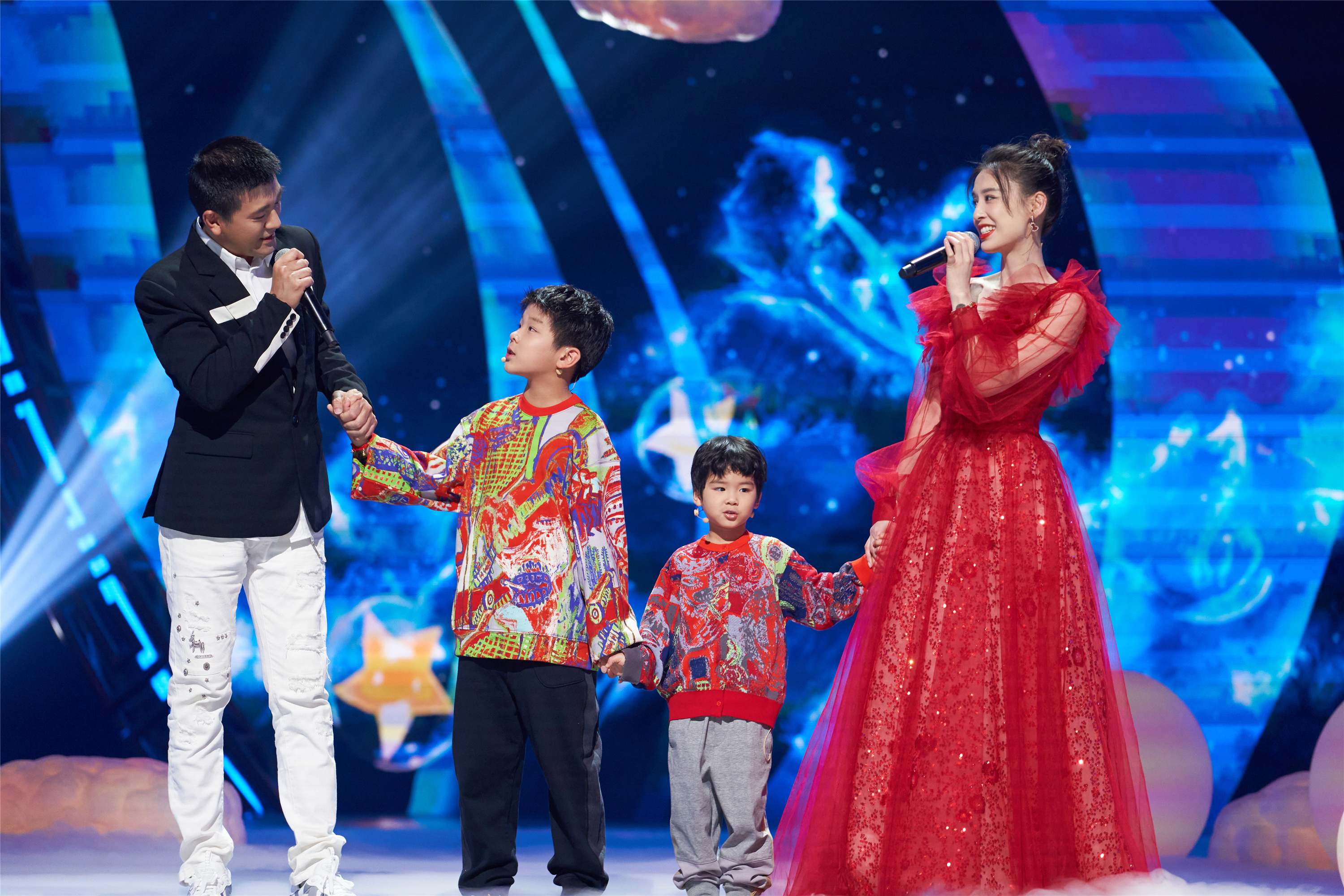 在春节期间,她带着两个孩子和丈夫一起登台献唱,孩子们好不可爱。