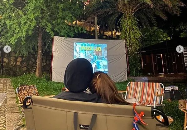 周董还在社交平台上晒出自己家院子里的小篝火派对,前面还放置了一个幕布,上面显示的是一家四口的全家福。