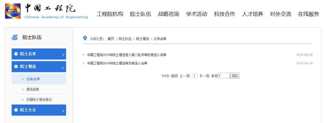 目前,中国工程院仅正式发布了中国工程院2019年院士增选进入第二轮评审的候选人名单: