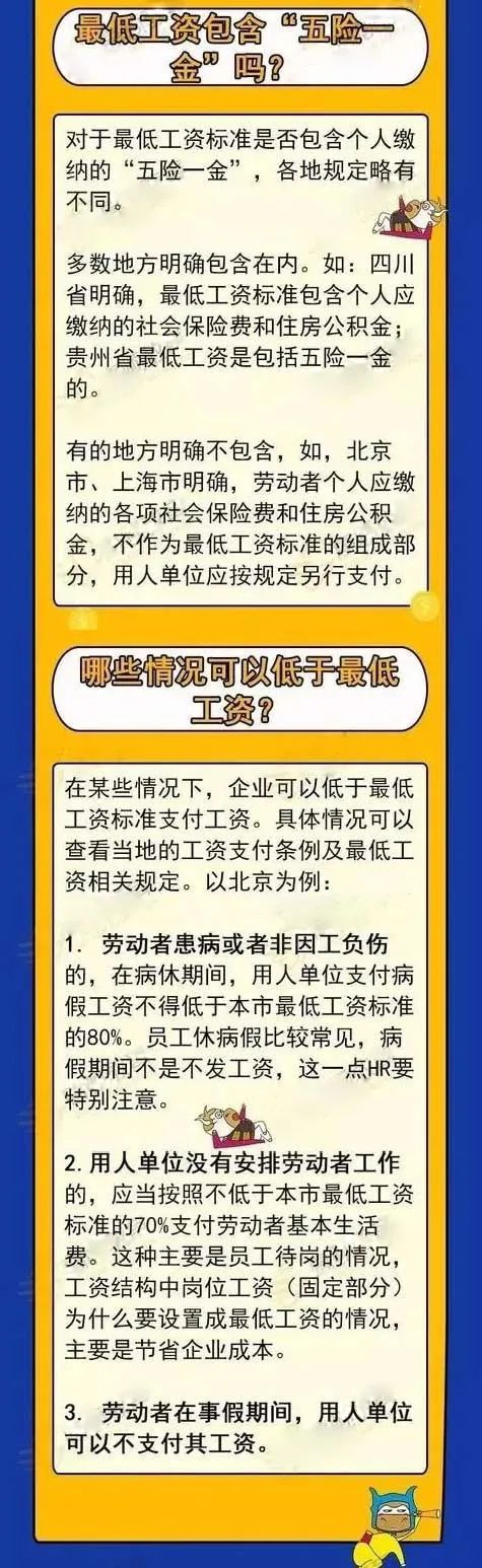 另外,有的小伙伴不清楚最低工资标准是否包含五险一金、哪些情况可以低于最低工资标准发工资?