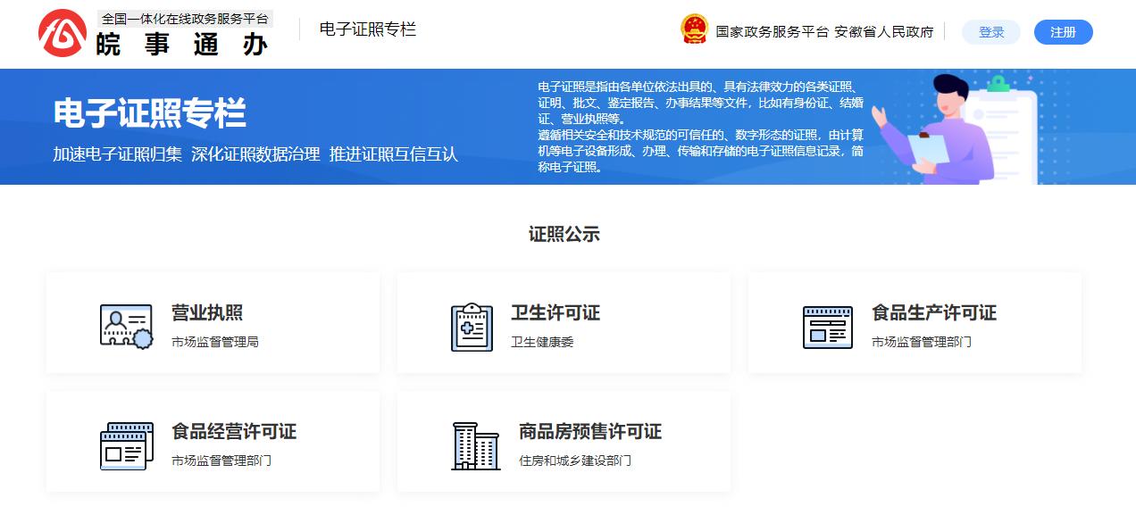 近日,安徽政务服务网上线了“电子证照专栏”,开通了营业执照、卫生许可证、食品生产许可证等证件公示服务,通过安徽政务服务网输入相关信息即可进行真伪验证。