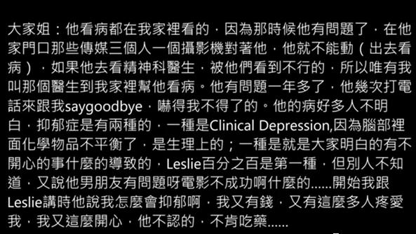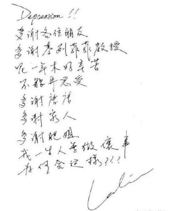 “Depression(沮丧、抑郁)。多谢各位朋友,多谢麦列菲菲教授。一年来很辛苦,不能再忍受,多谢唐唐,多谢家人,多谢肥姐。我一生没做坏事,为何这样?”下款署名:Leslie。
