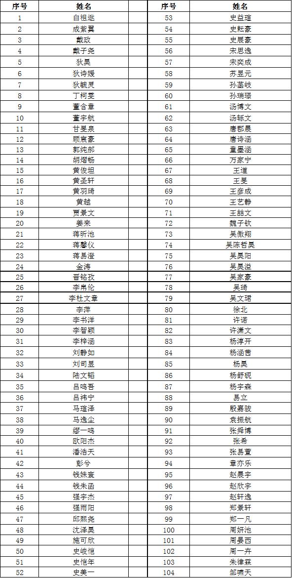经资审、笔试和面试等环节,江苏省溧阳中学自主招生择优录取104人,现将名单(按姓名拼音排序)进行公示,公示时间:2021年5月17日-5月21日。若有异议,请与学校联系,或向市纪委纪检组反映。对于公示后无异议的考生,请携带准考证、身份证(或户口本),在家长(戴好口罩,出示健康码,做好个人防护)陪同下,于5月23日下午1:40到学校行政楼四楼会议室,签订协议、办理有关入学手续。