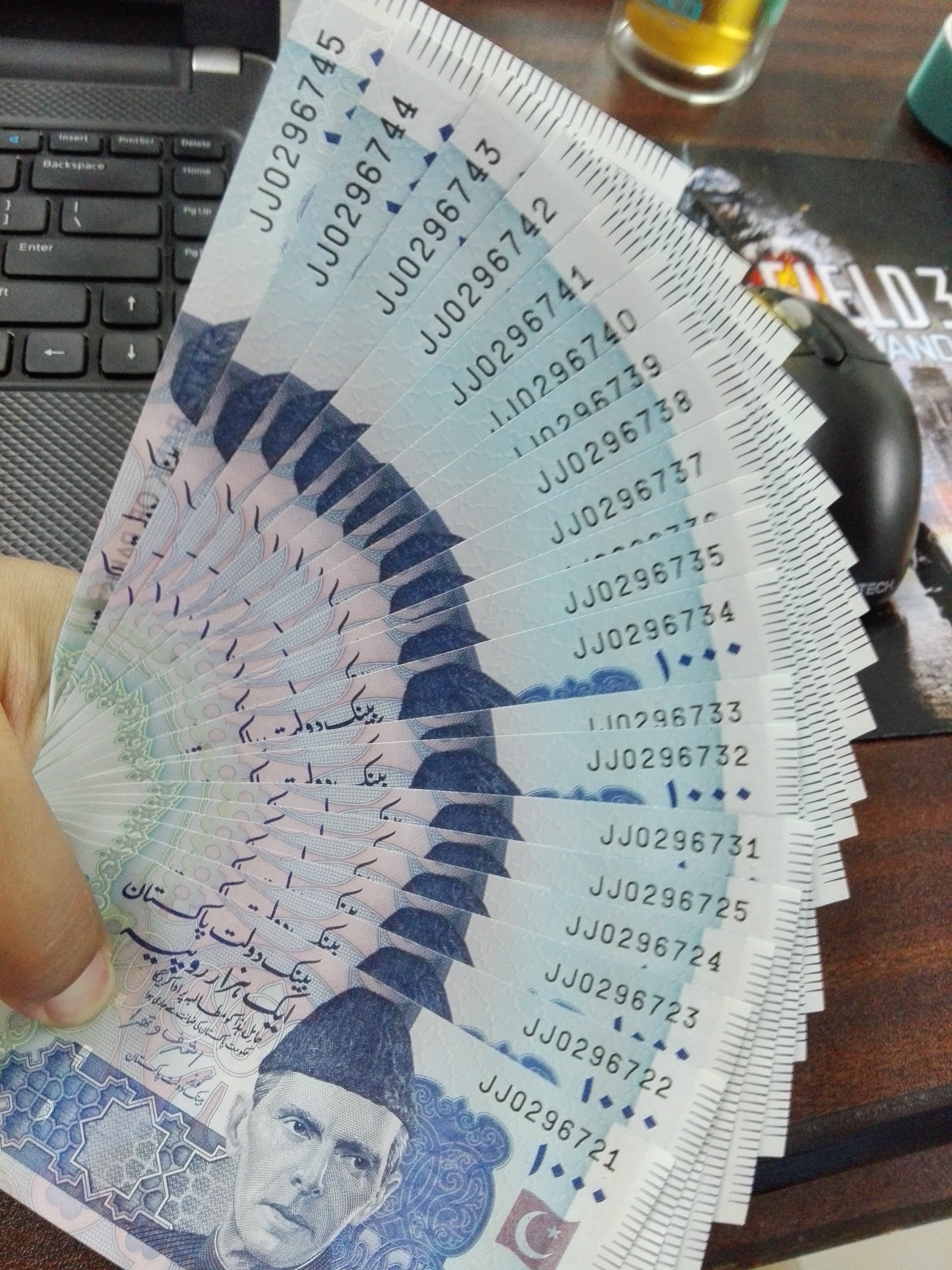 又到月底了,公司今天给我们发补助了,发了一沓1000面值的巴基斯坦卢比,因为在巴基斯坦工作,工资是以人民币形式发到国内卡上的,所以公司每月会单独给我们发一部分补助,作为我们在当地的花费,今天是发补助的日子,心情跟这一月的太阳一样,美美哒。
