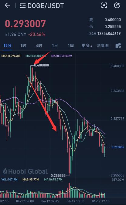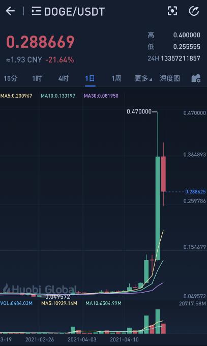 4月15日,狗狗币大涨50%;4月16日再度暴涨,24小时内涨幅一度达250%,最高触及0.47美元/枚,总市值一度突破600亿美元。