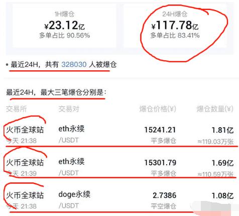 公开数据统计显示,截止到4月16日当晚23点20分,全网过去24小时爆仓来到了可怕的117.78亿人民币,而这个时间过去两三个小时爆仓额最多,其中最大三笔爆仓全部来自火币。