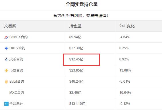 比特币家园网数据显示,目前火币合约实盘持仓量为12.45亿美元,持仓量排在OKEx、币安、Bybit之后。