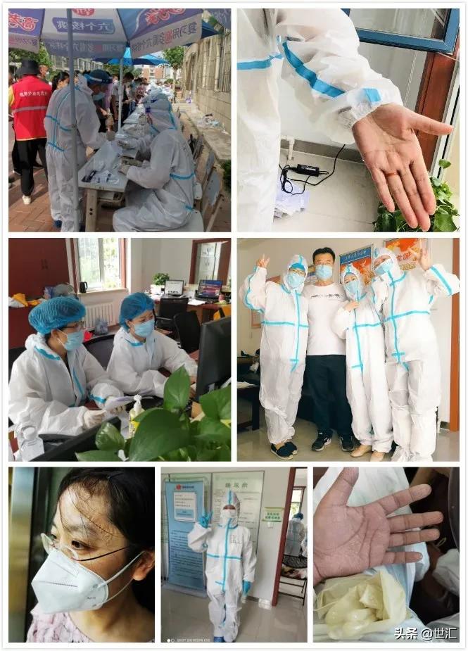 防护服下,是教师们层层湿透的衣衫;长时间的佩戴防护手套,每个人的手中已经析出白色的盐渍;阳光的直射,防护面具已是一层水雾;为了数据的准确,口读的教师口罩里都是满满的水汽和汗水……