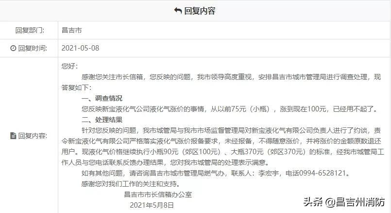 您反映新宝液化气公司液化气涨价的事情,从以前75元(小瓶),涨到现在100元,已经用不起了。