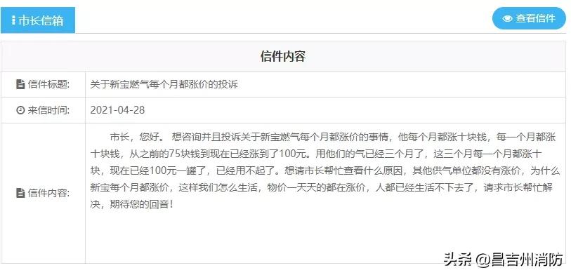 市长,您好。想咨询并且投诉关于新宝燃气每个月都涨价的事情,他每个月都涨十块钱,每一个月都涨十块钱,从之前的75块钱到现在已经涨到了100元。用他们的气已经三个月了,这三个月每一个月都涨十块,现在已经100元一罐了,已经用不起了。想请市长帮忙查看什么原因,其他供气单位都没有涨价,为什么新宝每个月都涨价,这样我们怎么生活,物价一天天的都在涨价,人都已经生活不下去了,请求市长帮忙解决,期待您的回音!