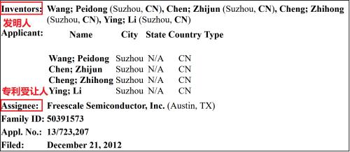 而且,从这四位工程师所申请过的专利情况来看,四位工程师只是“发明人”(Inventors),飞思卡尔半导体公司才是专利受让人(Assignee).