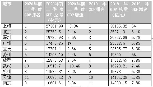 表1:2019年GDP前11名城市的GDP排名、总量和增速