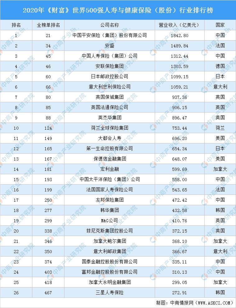 中商情报网讯:近日,《财富》发布了2020年《财富》世界500强排行榜,人寿与健康保险(股份)行业共计26家企业上榜,营收共计18940.26亿美元,6家企业营收超1000亿美元。中国平安保险(集团)股份有限公司位居榜首,营收1842.80亿美元。安盛排名第二,营收1489.84亿美元。中国人寿保险(集团)公司位居第三,营收1312.44亿美元。