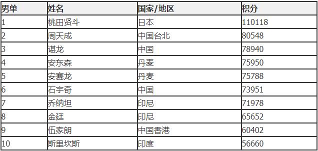 第六名:国羽男单石宇奇,在印尼公开赛脚踝受伤之后,错过七八场高积分赛事,导致积分严重下滑,石宇奇将会在中国澳门公开赛复出,进入抢积分阶段,祝石宇奇复出首战能旗开得胜,一步一步的挣取积分,重回巅峰!