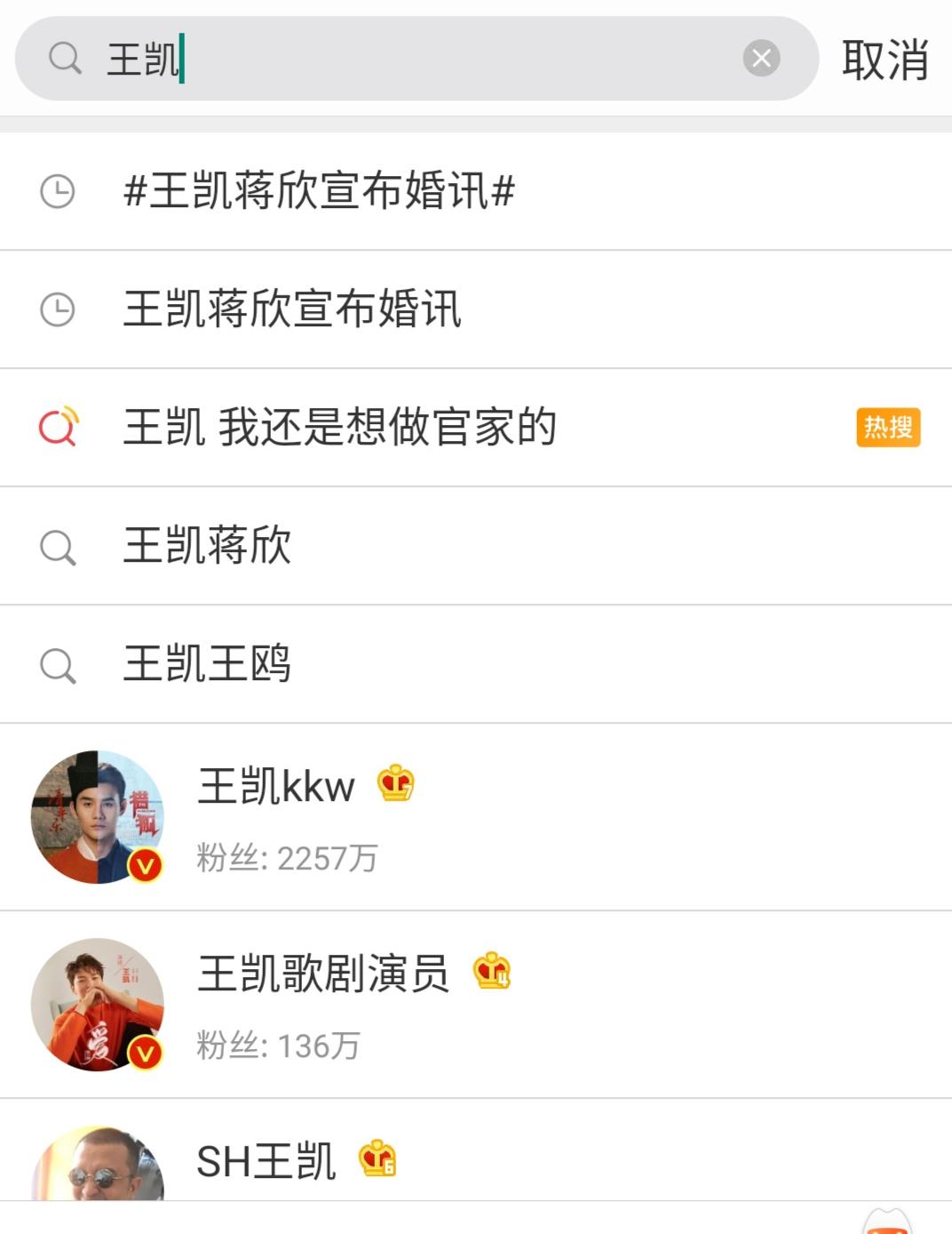 在某博社交平台上,搜王凯两个字,第一个词条就是王凯蒋欣宣布婚讯,但是点进去会发现什么东西都没有,小编随后又各自去了王凯和蒋欣的主页进行查看,翻了许久都没有看到双方有一人说这方面的消息,可以肯定是谣言。对于为什么词条会出现这个,网友怀疑是词条被买了。