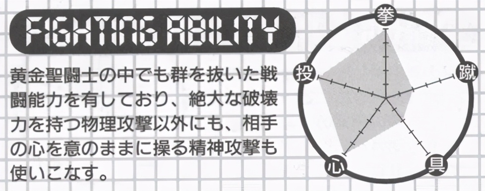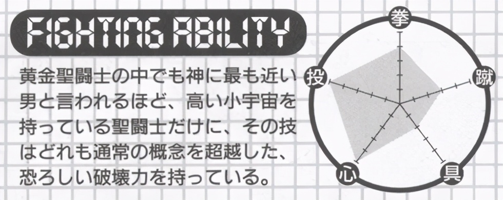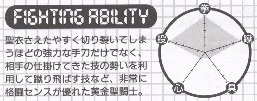 念力和投技非常出色。漫画中有着“念动力最强的圣斗士”之誉,在《大全》中就直接说他是“圣斗士中的最强者”——考虑到日本漫画设定中“最强”字眼滥用,大家也就参考一下吧。