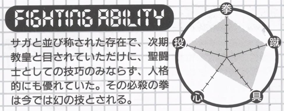 非常恐怖的能力,五项能力全部达到了顶点,居然完全没有弱点。虽然史昂很强,但我不明白为什么他的武器能力也是5,是在圣战中用了好友童虎的武器吗。