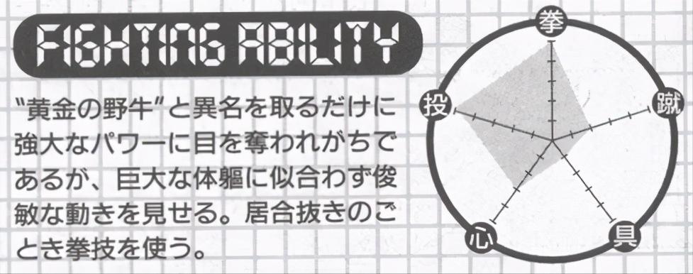 介绍:号称“黄金野牛”,对战时的直观印象是其强大的力量,身形巨大的同时灵活度却没有受到影响。拳法类似剑道中的“居合斩”。