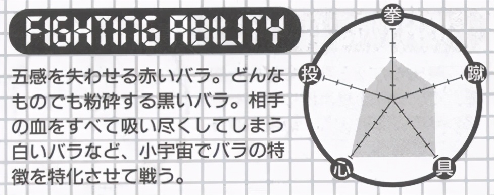 介绍:有着操纵玫瑰作战的独特能力,其中有让对方无感尽失的红玫瑰、无坚不摧的黑玫瑰,以及吸尽对方血液的白玫瑰。