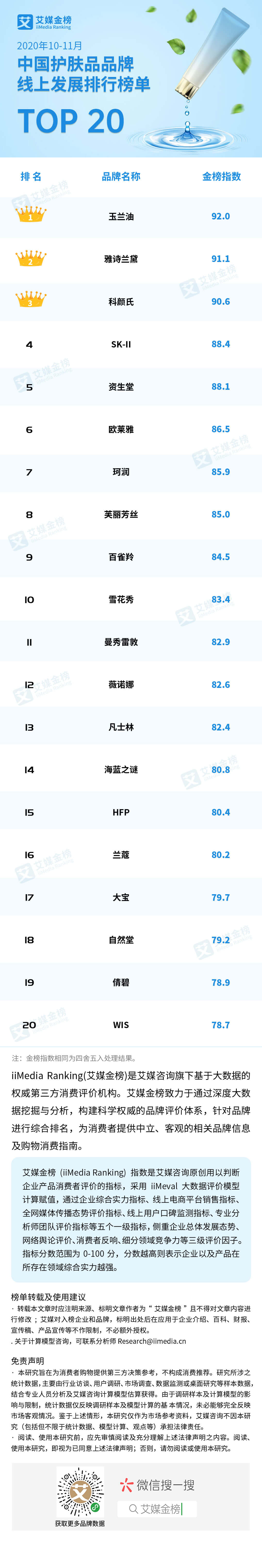 2020年10-11月中国护肤品品牌线上发展排行榜单TOP20:国产护肤品迎发展新机遇