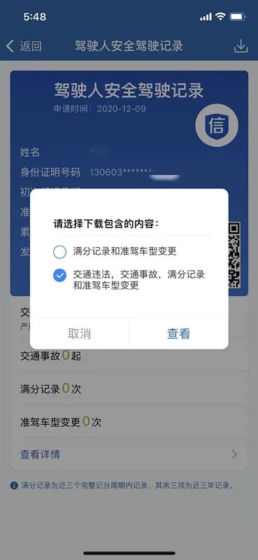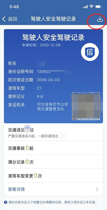 点右上角下载键,您可选择满分记录和准驾车型变更、交通违法、交通事故、满分记录和准驾车型变更查询,结果查询后保存并供您打印使用。