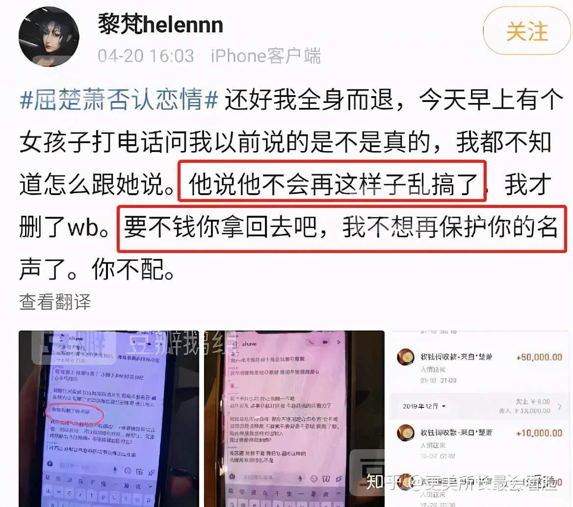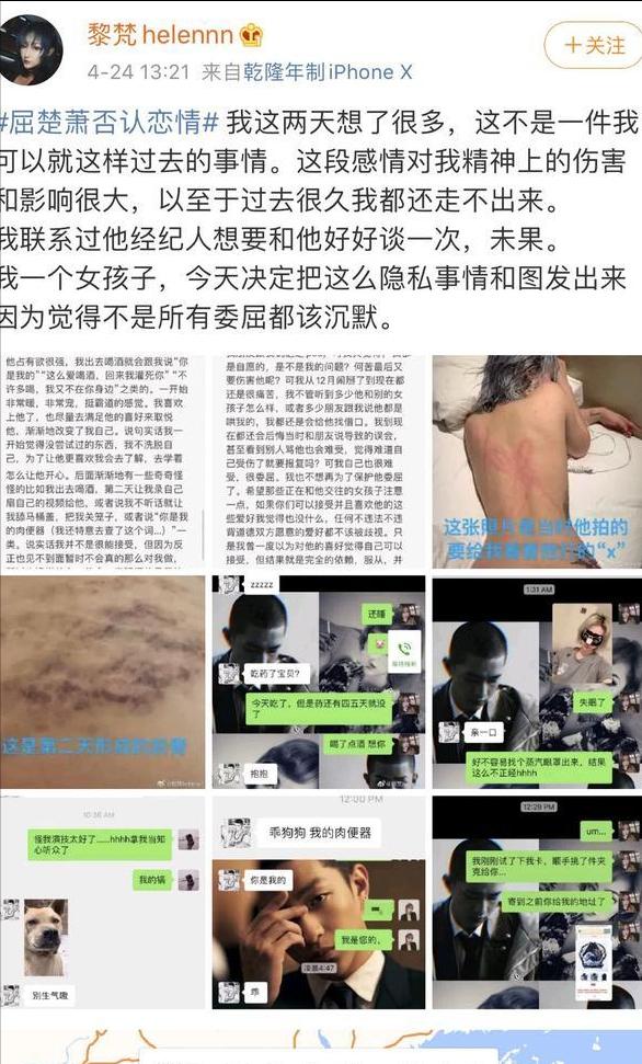 4月24日,屈楚萧前女友有理有据地公布了与屈楚萧恋爱时签约的主仆协议、聊天内容、用数据线殴打的证据照片。