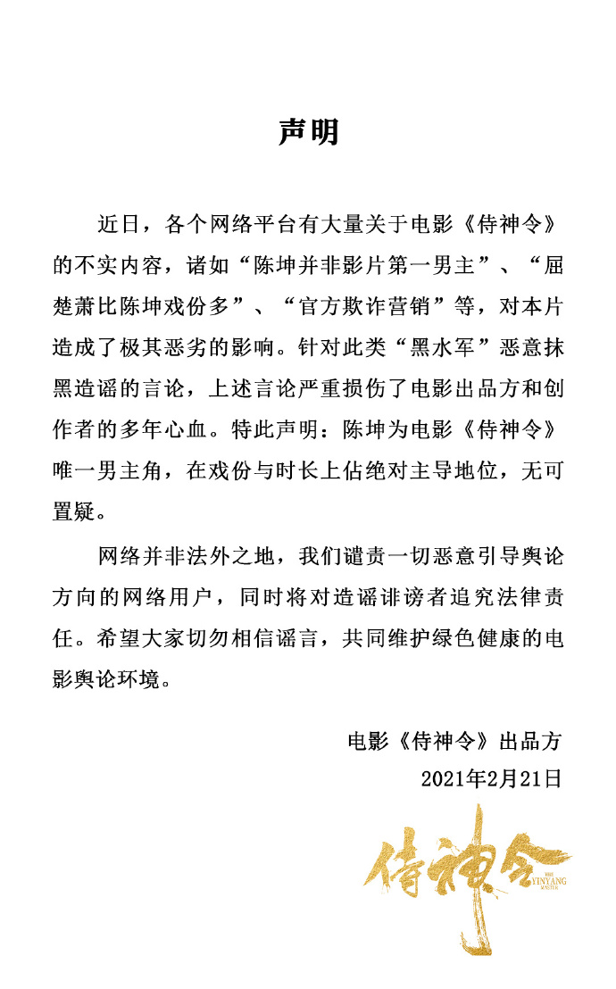 刚刚,《侍神令》官方发声明说陈坤是电影的绝对男主,网友们立即就炸开了锅,上映10天票房才2.35亿,是整个春节档的倒数第一,不在自身找原因,现在是在这找人顶锅拿陈坤炒作吗?