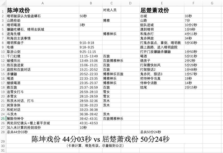 《侍神令》官方发出陈坤是绝对男主时,网友们笑了,当我们瞎呀。有人立即有截图把陈坤出场几次,屈楚萧出场几次,每次两人出场分别是几分几秒的表格发了出来。
