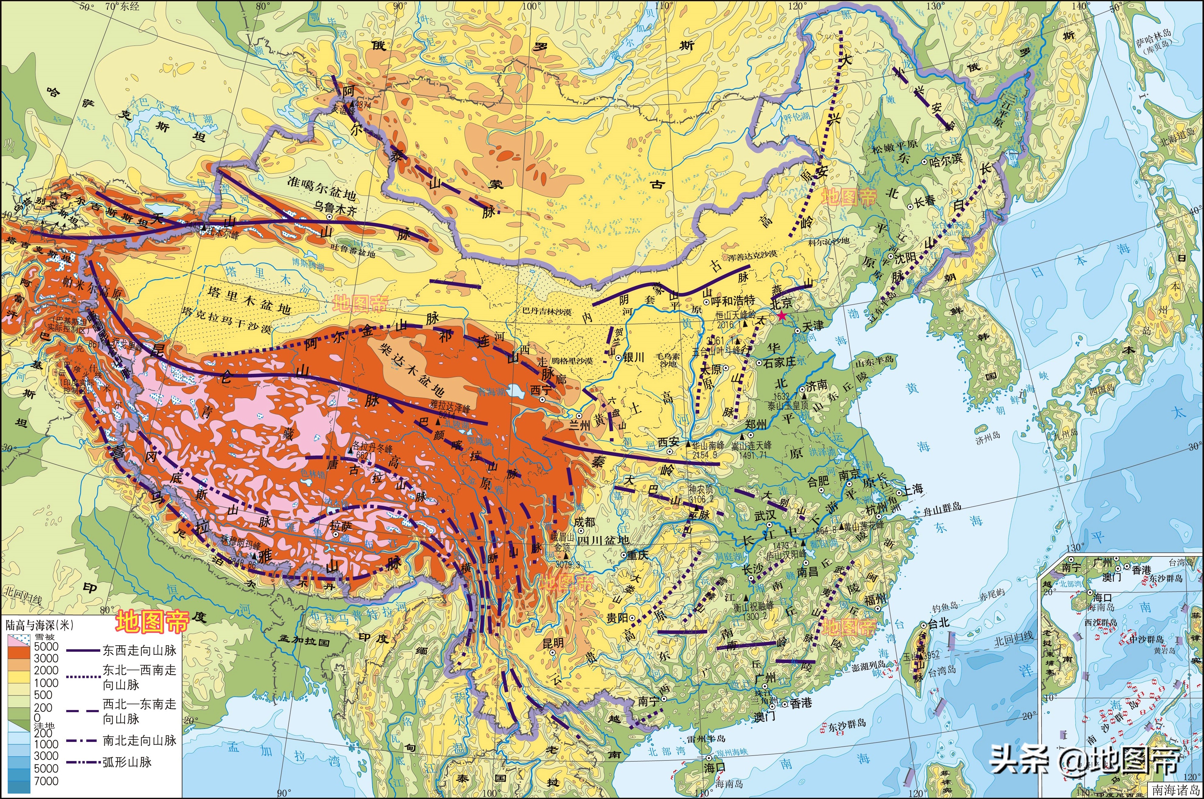 东西走向:天山山脉、阴山山脉、昆仑山脉、秦岭,南岭。