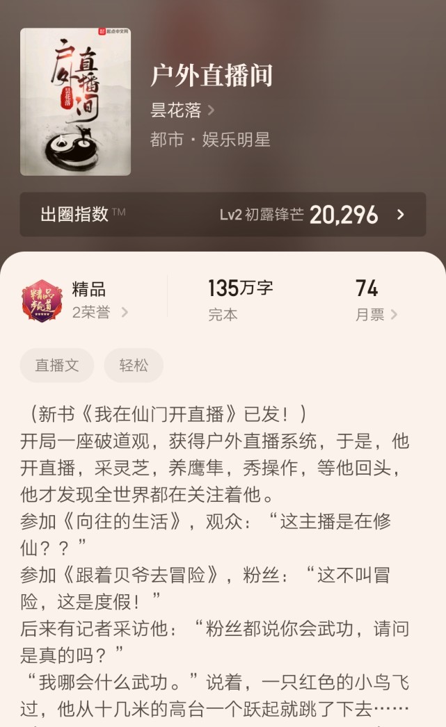 昙花落的作品,一本轻松类的户外直播文,主角可以根据直播间的人气通过系统抽取各种各样的奖励。小说天然带有科普文的性质,看着还是比较放松的。完结时均订成绩在九千以上,还是不低的。如果你对探险直播类的小说有兴趣的话,可以留意一下。