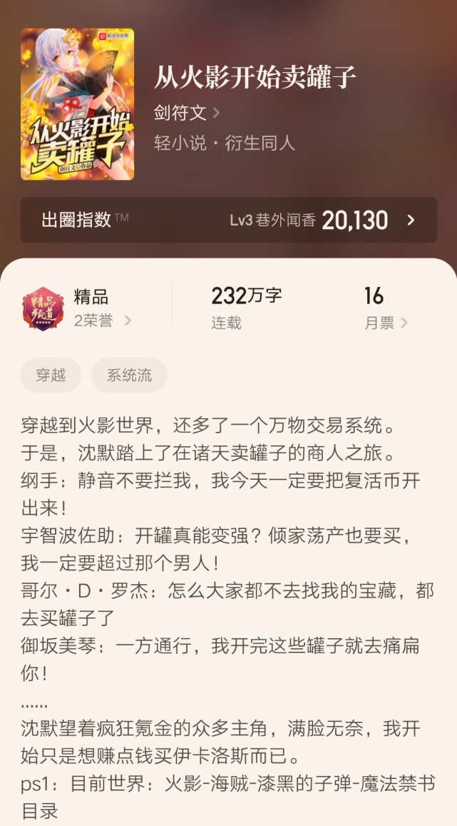 剑符文作品,一本综漫同人类的无限流小说,主角开局穿越火影世界,还绑定了一个万物交易系统,自此走上了一条卖罐子开大奖的商人之路。