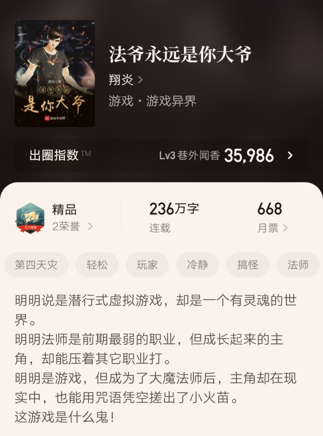 翔炎作品,一本均订破万的网游文,奇幻风格,主角是个法师玩家。