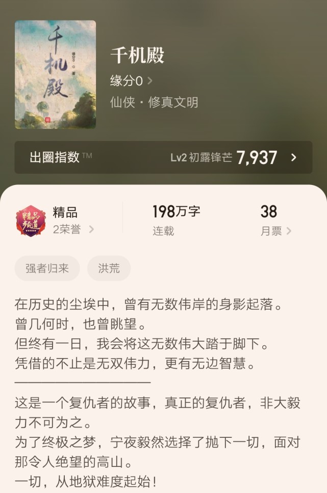缘分0作品,也是他2019年回归起点之后的第三本小说。两年时间三本小说,不得不说他还是很高产的。