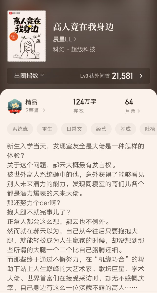 大神晨星LL作品,一本写了不到八个月的小说,原本是讲述一个绑定了世外高人系统的主角,如何引导身边的人发挥自身潜力的故事。只是写着写着就偏向于主角如何在游戏行业大杀四方,走上人生巅峰的故事了。
