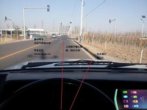 右转进入中间车道后,调整车身位置,并保持好车速(15~30之间),手放松,目视车道远处,如果车辆跑偏可做方向盘微调(方向盘转动3度一公分左右)并马上回正方向盘;第一个路灯杆开始到第三个带摄像头的路灯杆结束