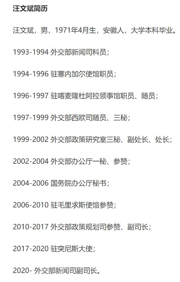 大学本科毕业之后,汪文斌进入了中国外交部工作,如今已经从事了外交工作长达28年之久。汪文斌的履历十分丰富,如今担任中国外交部新闻司副司长,沉稳大气。