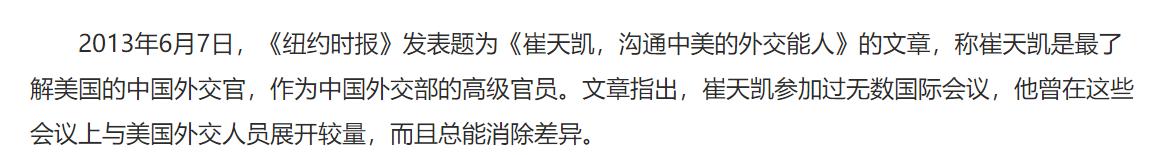 2013年,61岁的崔天凯从美国纽约乘坐火车抵达华盛顿,履新中国驻美国大使。那个时候的崔天凯已经一头银发,也有了半辈子的外交生涯。对于这次在美国就任,显示出看国家对于他的器重与信任。