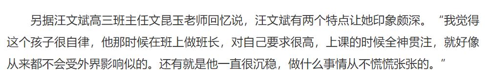 金陵中学的老师和同学回忆汪文斌,那个时候的他就已经十分具有口才。在汪文斌的身上,看到了两个优秀的特点,一是自律,二是沉稳。汪文斌在中学阶段就一直担任着班长的职务,对自己要求颇高。即使在毕业多年以后,他还不忘给母校送上校庆的祝福。