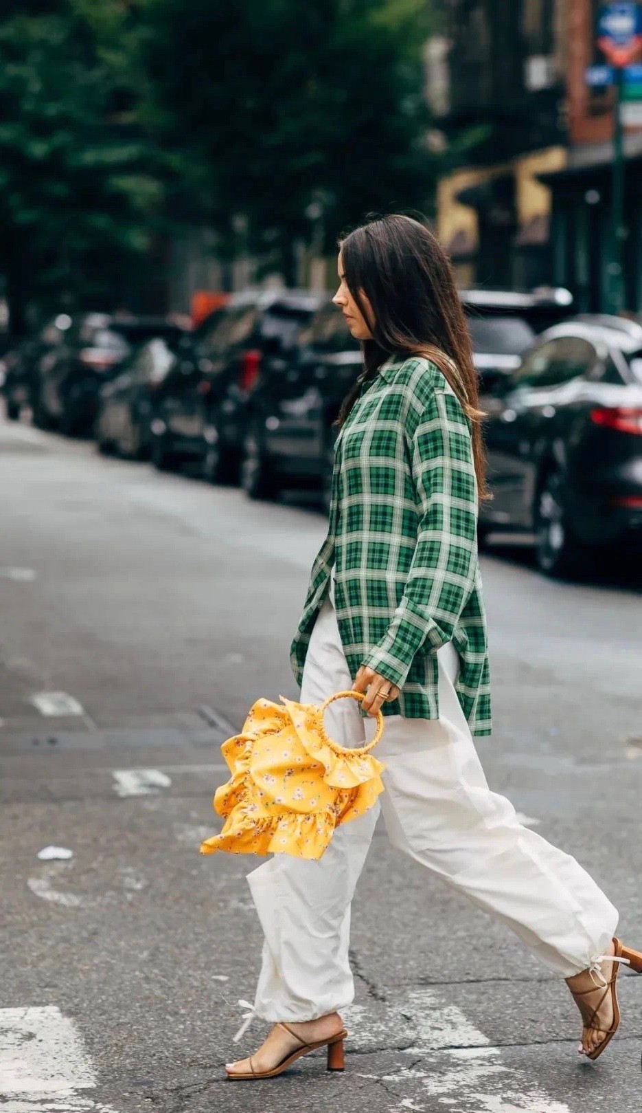 黄色和绿色的搭配不一定非得体现在服装上,你也可以利用配饰来打造整套造型,绿色衬衣与白色阔腿裤的搭配一种小清新的感觉油然而生,再加上黄色包包的点缀是不是瞬间让整体的造型更加的明媚,少了一丝单调,多了一分活力。