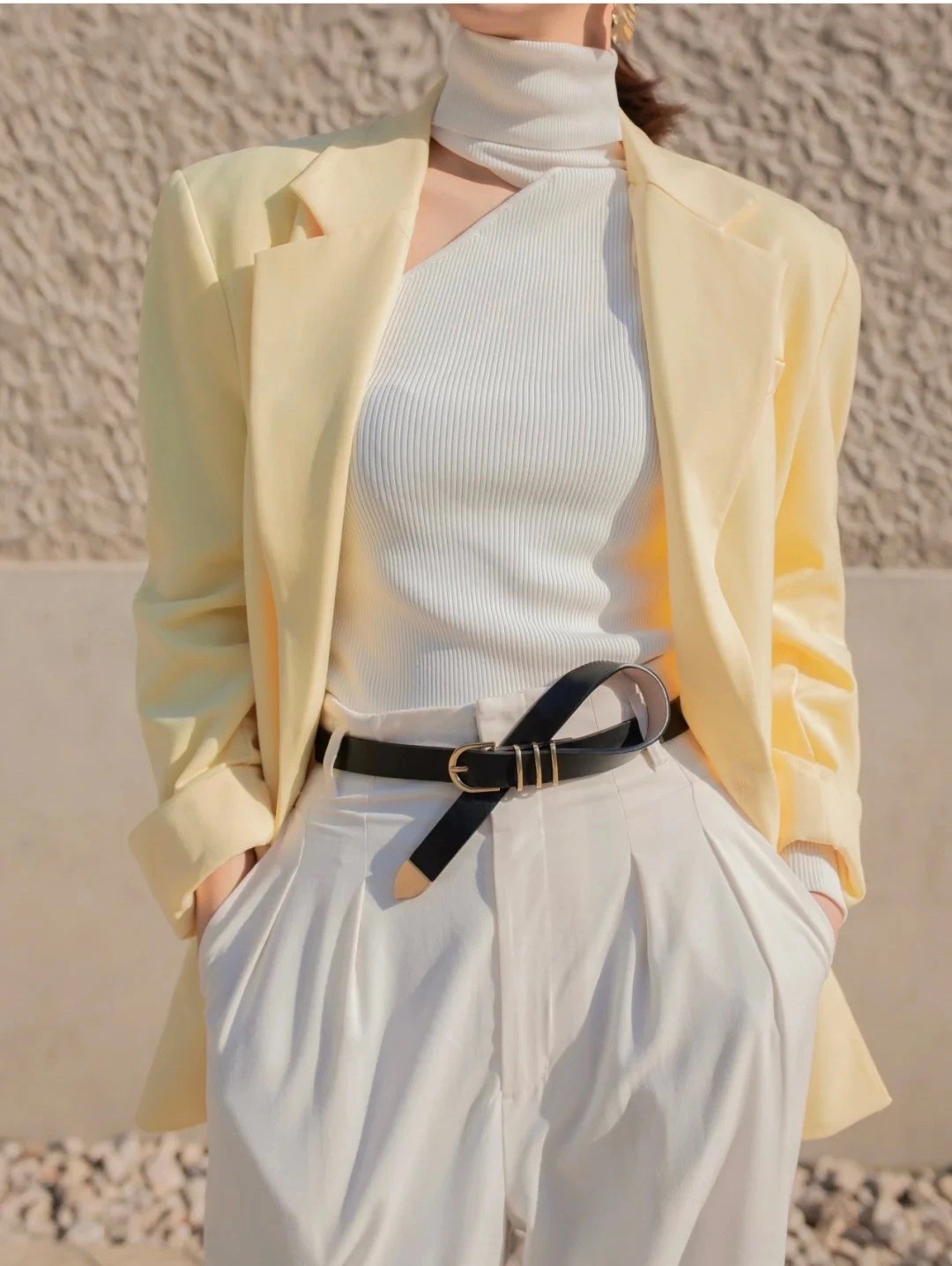 饱和度比较低的黄色西装与白色内搭和白色长裤搭配在一起,会让整个人都弥漫出一种温柔的气质,腰间黑色腰带的点缀,在温柔中又增添了一分成熟大气感,完全不挑人和肤色,如果喜欢长裤的洒落利落的女孩子们,就可以这样子搭配,绝对不会出错。