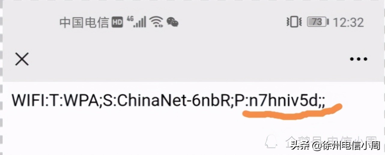 然后把这个带有二维码的截图发给自己的家人,朋友,或者自己的相册,然后识别二维码就会弹出一个对话框,密码就显出试出来了,冒号后面8位数就是无线网密码